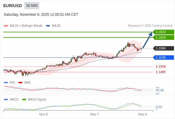 欧元/美元 当日内 : 看涨,当 1.1535 为支撑位,目标定在1.1622。