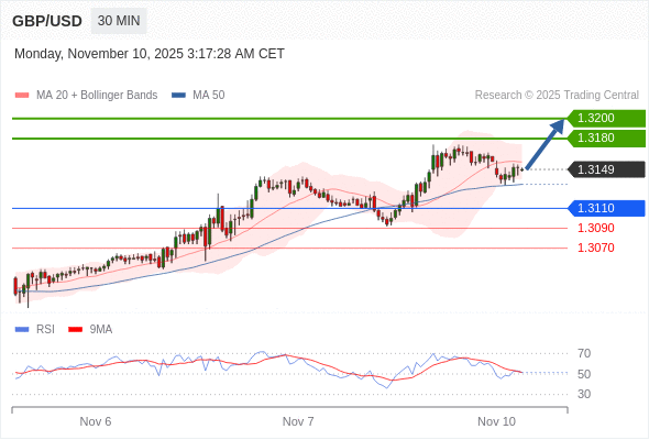 在 1.3110 之上,看涨,目标价位为 1.3180 ,然后为 1.3200 。