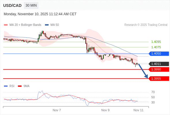 在 1.4050 之下,看跌,目标价位为 1.3990 ,然后为 1.3955 。