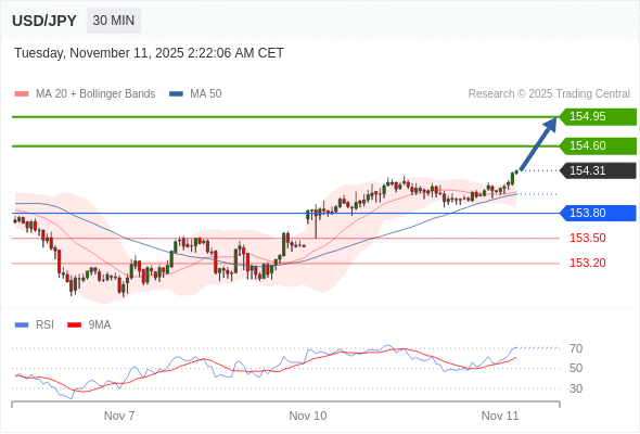 在 153.80 之上,看涨,目标价位为 154.60 ,然后为 154.95 。