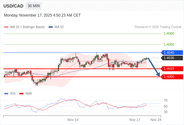交易策略: 在 1.4045 之下,看跌,目标价位为 1.4015 ,然后为 1.4000 。