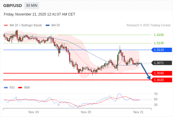 在 1.3110 之下,看跌,目标价位为 1.3040 ,然后为 1.3020 。