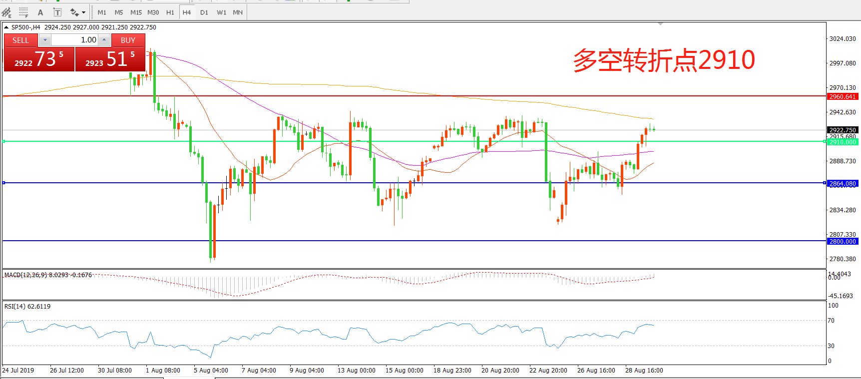4小时图看,标普500以2910为依托震荡上行,200周期均线成为上方阻力,MACD红柱,RSI指标走平,日内延续上行概率较大。