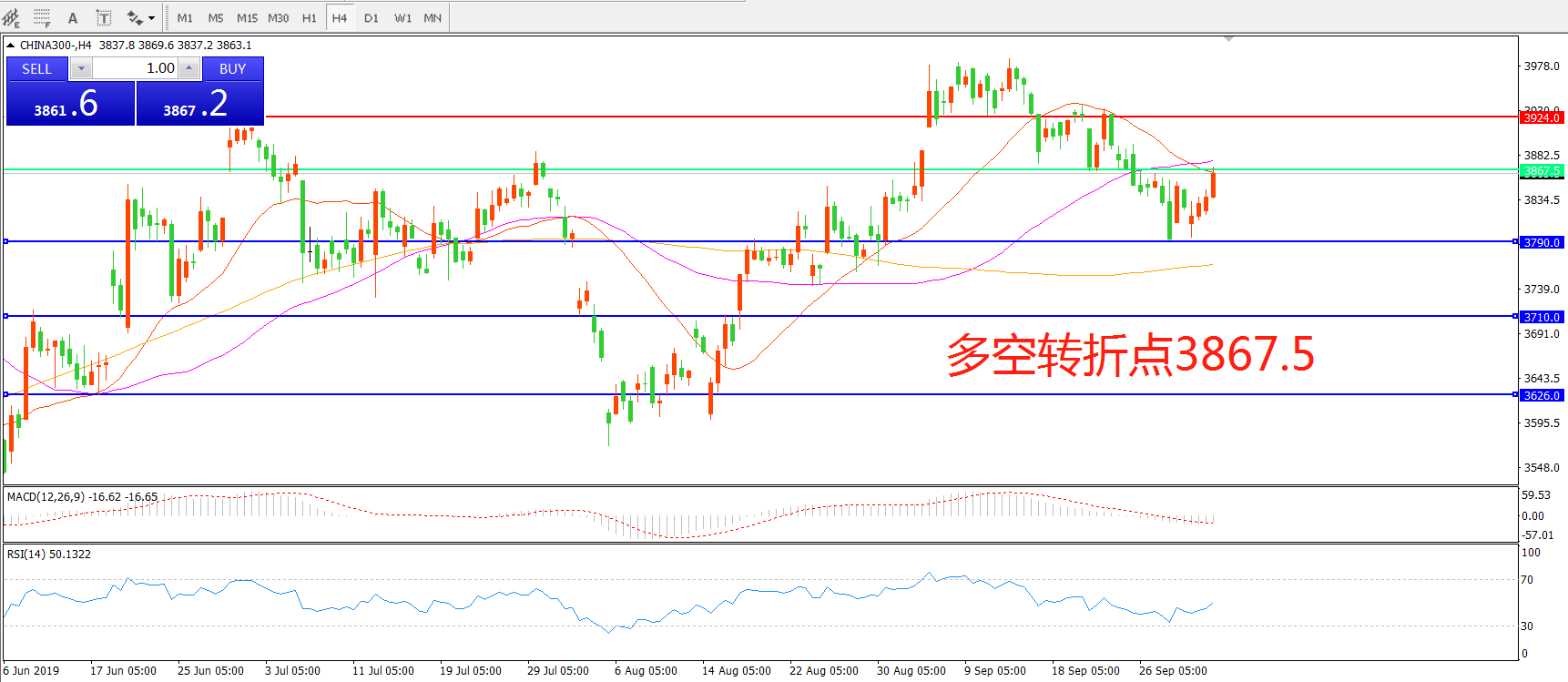 4小时图看,沪深300阳线连续拉升,短期走势有所回暖,3867.5一线如能突破,有望新来新一波涨势,均线系统走平,RSI指标向上,日内延续上行概率较大。