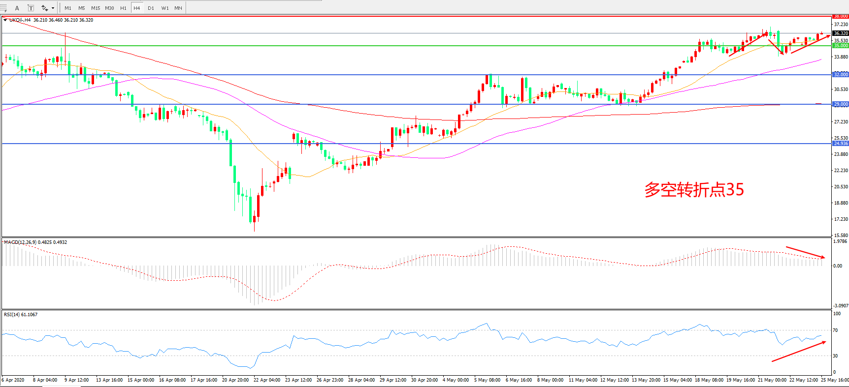 4小时图看,油价延续高位震荡,以35美元为依托进行短期整理,均线系统呈多头排列,MACD红柱减少,RSI指标向上,日内延续震荡概率较大。