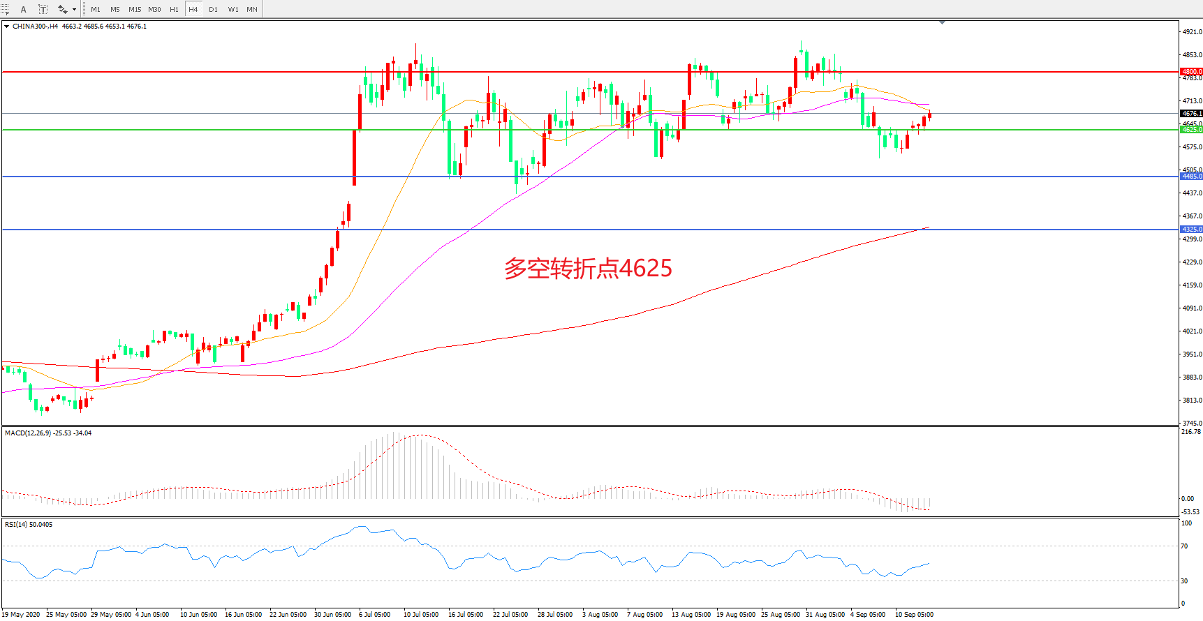 4小时图看,沪深300震荡反弹,短期走势有所回暖,4625成为短期多空分水岭,均线系统粘合形成上方阻力, MACD绿柱缩短,RSI指标向上,日内震荡上行概率较大。