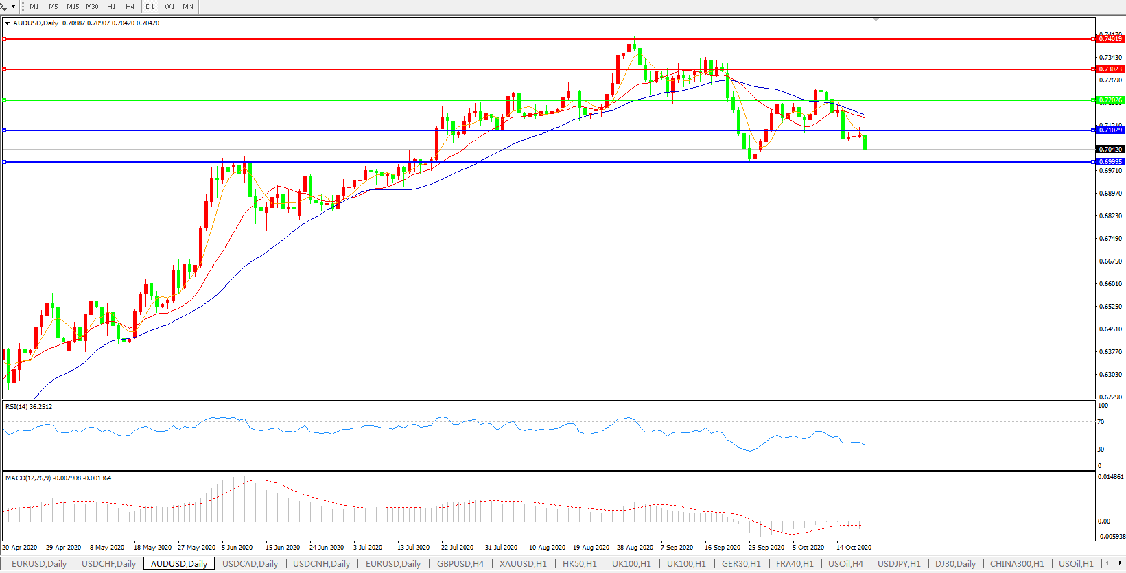澳元兑美元跌0.10%,报0.7074美元;纽元兑美元涨0.06%至0.6606;早些时候突破了在0.6632的55日移动均线,达到当日高点0.6646,市场仍在消化总理Jacinda Ardern的历史性胜利。早些时候,中国的经济数据增强了积极的风险偏好;中国9月份工业产值和零售额超过经济学家的预期,不过第三季度经济增长低于预期。