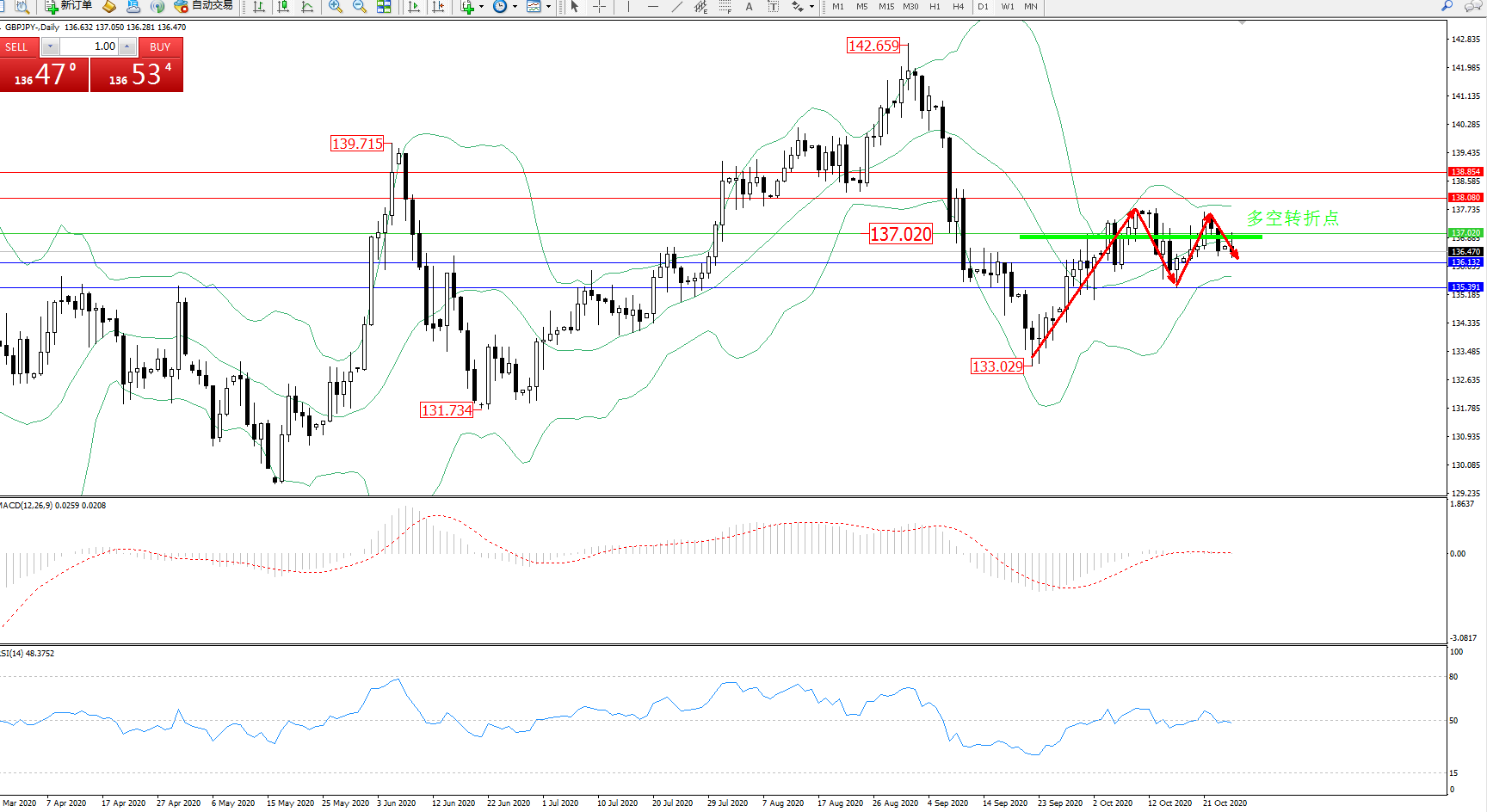 英镑兑日圆弱势回撤至136.477附近整理,英国和欧盟在最后一刻贸易协议的谈判中取得了良好进展,但渔业问题仍是最大的症结所在。若能达成协议,将可使持续五年的英退危机免于最后演变为一片混乱。英国在1月退出了欧盟,目前双方正试图达成一项协议,以解决在12月31日过渡期结束后,每年规模将近1万亿美元的双边贸易将要遵循的规则。英国国际贸易大臣特拉斯表示, “我们正在与欧盟进行紧张的谈判,我们已经取得了实质进展。但如果欧盟不准备达成一项允许英国保留主权的协议,那么我们将采用澳大利亚式的条款,我认为那是完全合理的。”经过英国威胁推翻部分退欧协议、约翰逊上周五短暂叫停谈判之后,欧盟表示准备就协议草案的法律文本进行磋商。英国和欧盟的首席谈判官员巴尼尔和弗罗斯特上周五会面,加紧进行谈判。