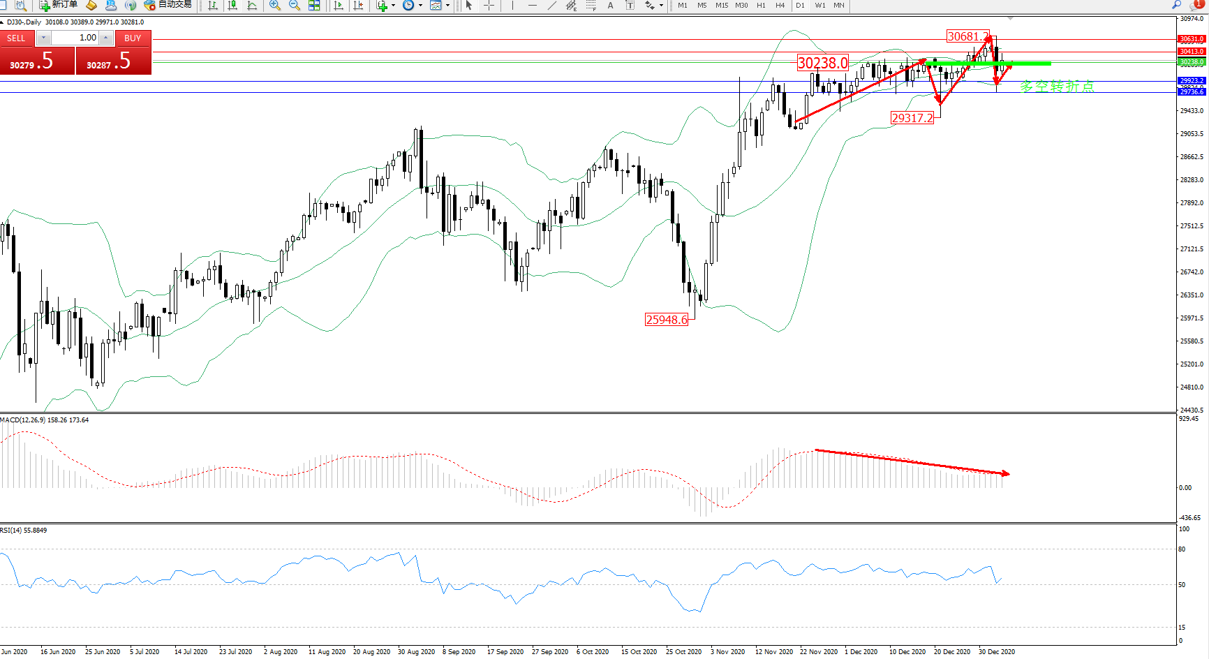 技术点评:多头动力延续布林带指标通道内高位维持窄幅整理后出现急速下挫,布林带指标呈缓慢张口走势后有收口迹象,高位抵达30681位置后短期遇阻,长时间处于高位震荡中,纠结于中轨附近持续震荡,MACD指标处于多头区域持续整理平移,RSI指标处于50均衡线上方震荡后急速回撤下行;