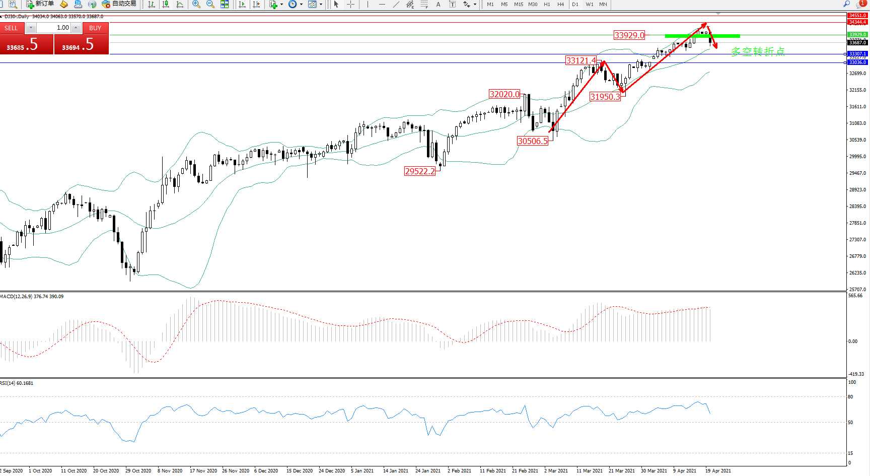 道琼斯指数4月20日(周二)收盘下跌257.12点,跌幅0.75%,报33820.51点;美股收盘,道指收跌,风险偏好出现了逆转;新冠病毒变种毒株的阴影笼罩一些经济体,且需求演变情况也不确定。在人们对经济重启前景升起新的担忧之际,股市与油价疲软帮助推动了债市涨势。10年期美债收益率盘中一度跌近5个基点,至1.555%,可能需要等待来自美联储的联邦公开市场委员会(FOMC)的消息,看看基调是否有变化,以及下一轮公债标售情况如何,但整体公债有需求;FOMC将于4月27-28日举行政策会议。