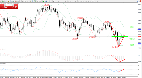 空头动力延续布林带指标通道中下轨区间持续震荡下行,低位抵达1.34112位置后得到支撑震荡上扬,触及布林带指标中轨附近节点后开始短暂整理中,布林带指标呈收口走势,短期多头动力或维持整理,上方压制关注1.37601附近,低位支撑关注1.34683附近,关注1.36231附近转折点,MACD指标处于空头区域低位震荡上移,RSI指标处于50均衡线下方空头区域维持弱势徘徊中,如图: