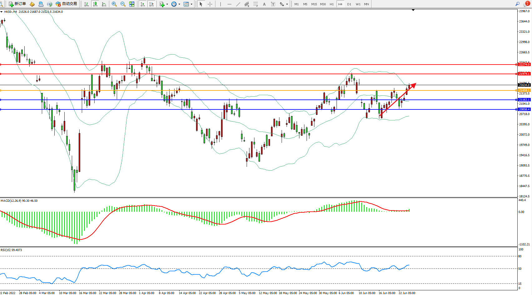 香港恒生指数6月24日(周五)收盘上涨445.19点,涨幅2.09%,报21719.06点;港股高开高走,三大指数涨势如虹,科技股领衔助力大市集体走强。恒生科技指数涨4.05%重回4800点上方。反垄断法落地,大型科技股美团涨超5%,快手涨4.55%,百度、网易、小米涨超3%,京东、美团、腾讯均涨超2%;生物科技板块大涨居前,心通医疗、科济药业均上扬超20%表现最佳,康诺亚、启明医疗等多只个股涨幅均超10%。