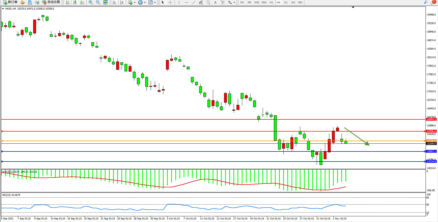 香港恒生指数11月3日(周四)收盘下跌487.68点,跌幅3.08%,报15339.49点;美联储连续第四次加息75个基点,全球金融市场表现低迷。港股低开低走,三大指数全线大跌,恒生科技指数跌3.84%险守3000点。大型科技股依旧引领市场风向,网易、阿里巴巴、百度均跌超6%,腾讯、京东、美团皆下挫;南下资金全日逆势净流入87.53亿港元,大市成交额不足千亿港元。
