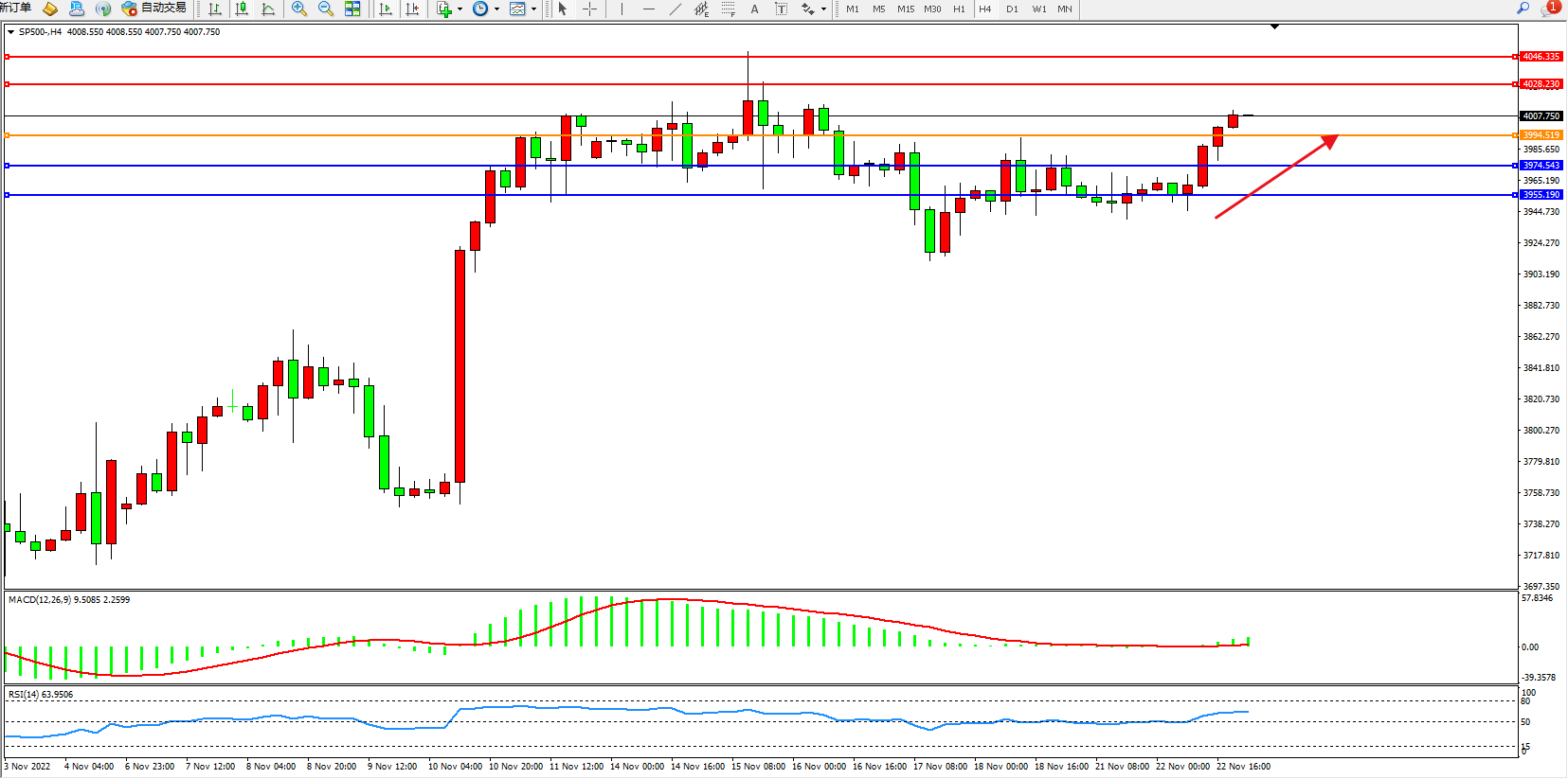 标普500指数11月22日(周二)收盘上涨53.64点,涨幅1.36%,报4003.58点;美联储最新会议纪要将是对美元的下一个关键考验,因为它将让人们了解美联储在12月14日下次会议前的政策思路。美国利率市场目前相信,美联储将在12月通过50个基点(加息)来放缓加息步伐,然后在明年达到5.00%左右的峰值。