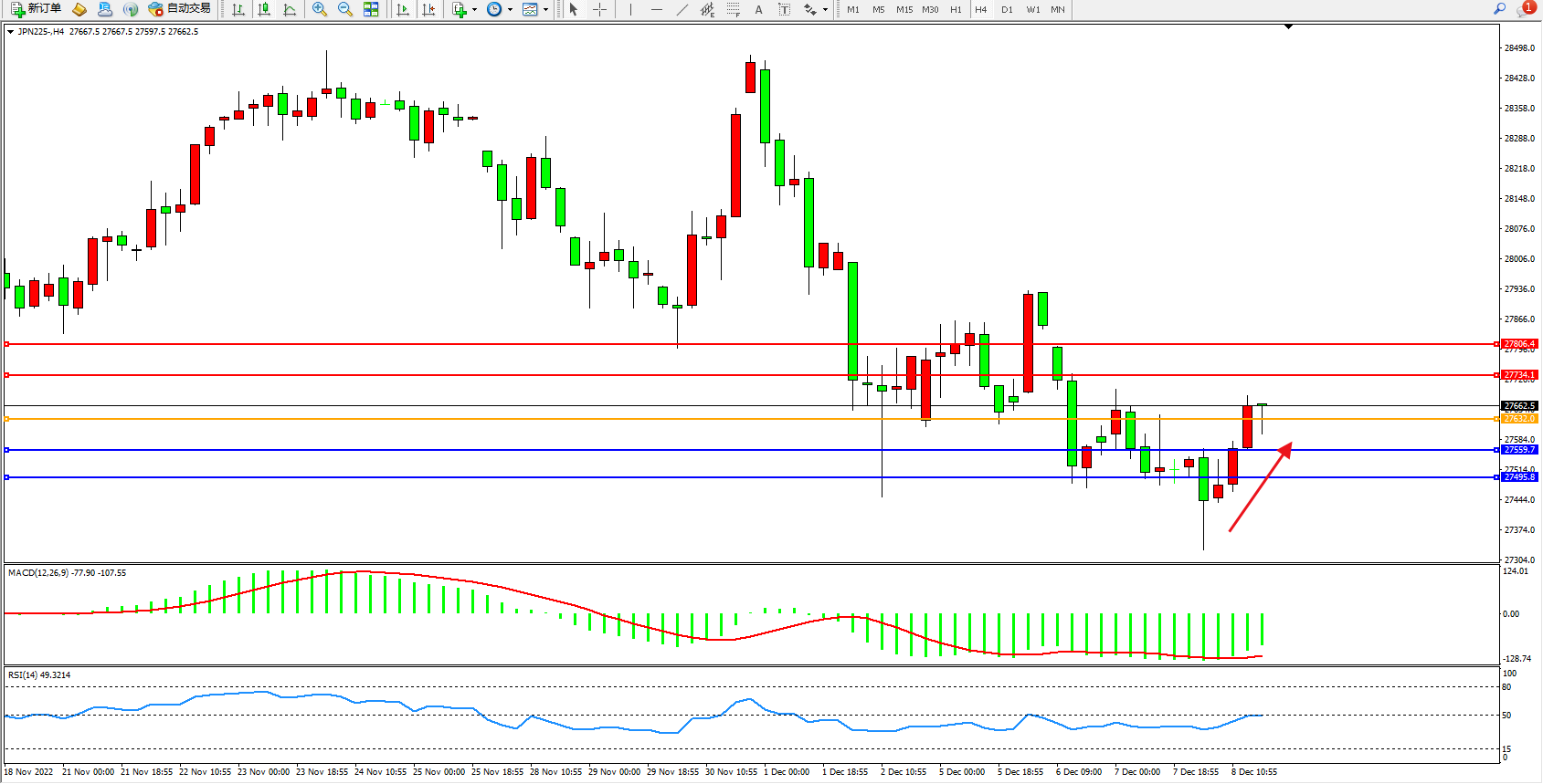 日经225指数12月8日(周四)收盘下跌124.40点,跌幅0.45%,报27562.00点。日本第三季度GDP折合成年率较前一季度萎缩0.8%,经济学家此前预计会下降1%。这一上调在一定程度上是由于出口增长强于预期,以及库存增加。
