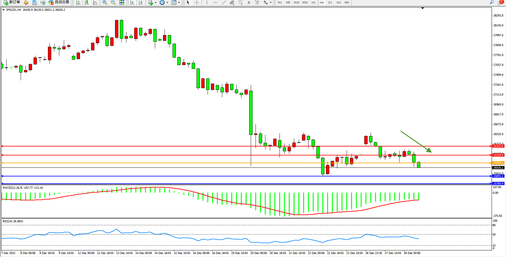日经225指数12月28日(周三)收盘下跌148.87点,跌幅0.56%,报26299.00点。日本央行12月会议意见摘要显示,央行决策者认为有必要保持超低利率,但讨论了薪资上涨可能最终彻底消除重返通缩风险的前景。
