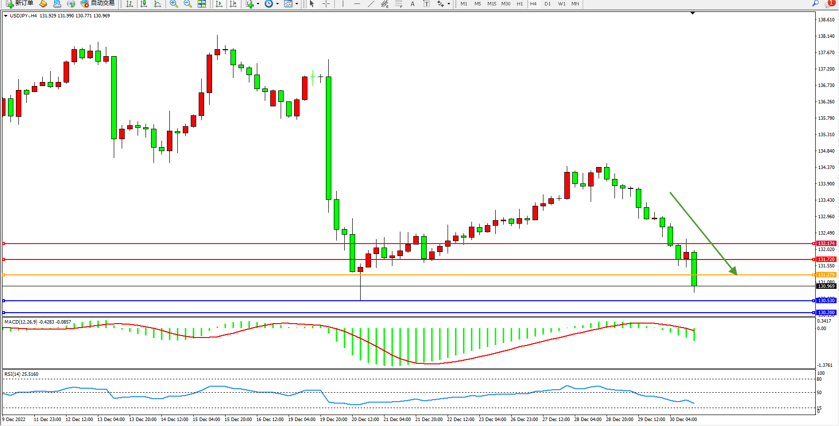 4小时图看:空头动力维持低位持续下挫,短期跌势或将延续,市场空头情绪态势良好,MACD指标处于空头区域整理下移,RSI指标处于空头区域低位下行中;