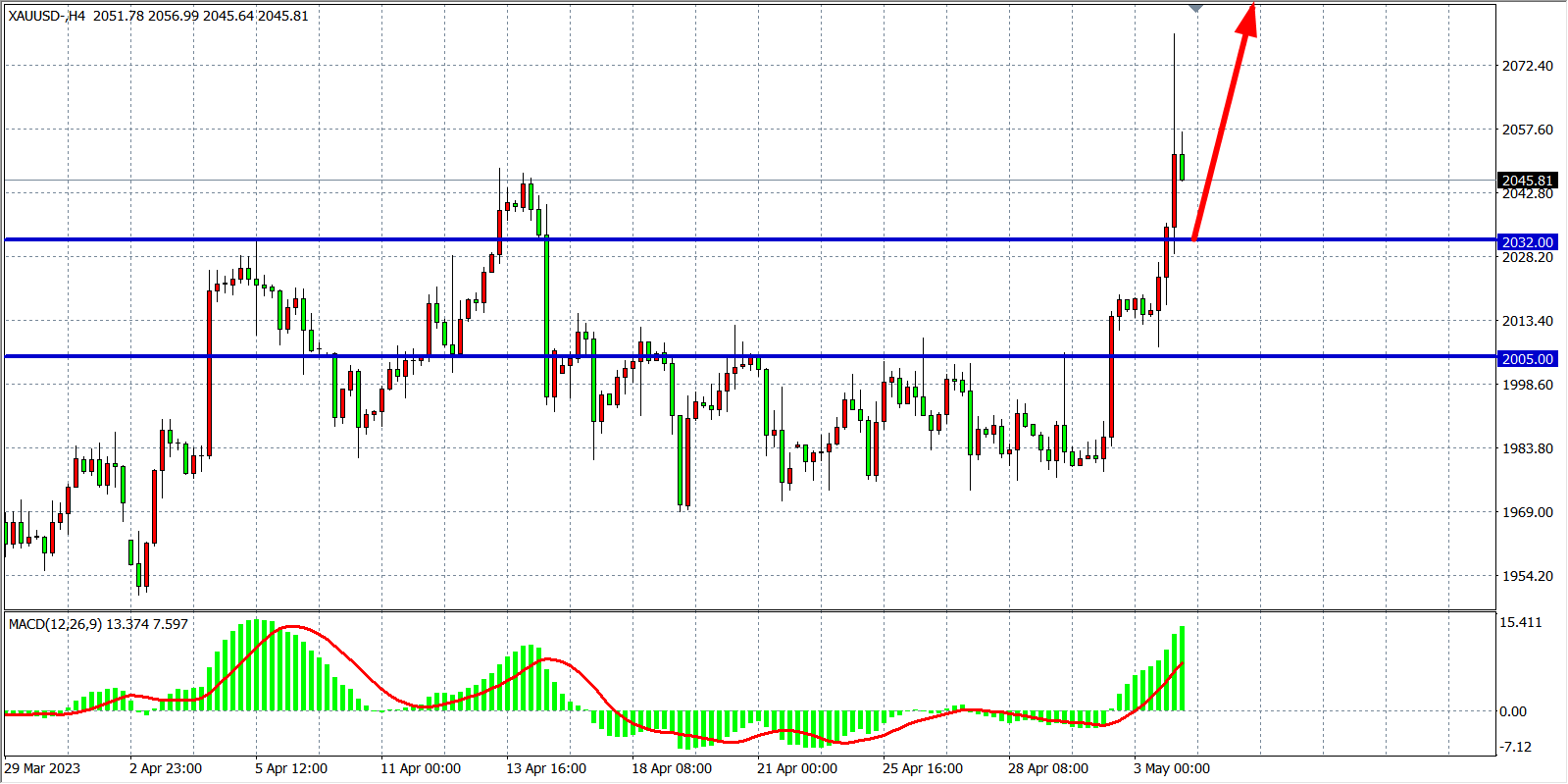 4小时图看,黄金在2012的支撑之上进一步走高,一度大涨至2080附近,MACD量能在零轴之上大幅放量,行情延续强势多头,目前支撑上移至2032附近,日内在2032之上继续看涨,上方目标2060-2080附近。