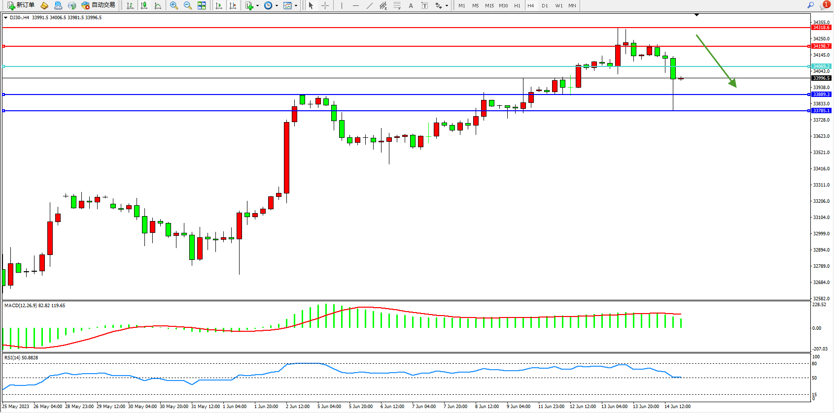 道琼斯指数6月14日(周三)收盘下跌231.40点,跌幅0.68%,报33980.72点;北京时间周四凌晨2点,美联储公布最新的6月利率决议,美联储维持利率不变,至5.00-5.25%不变,符合预期。美联储暂停加息,自2022年3月以来的连续10次加息暂告一段落。