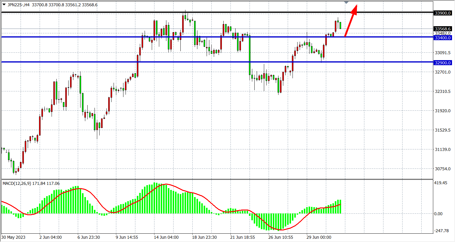 周一(7月3日)日经225指数收盘上涨538.46点,涨幅1.62%,报33727.50点。随着日本国内经济的进一步改善,日经指数可能进一步上行。