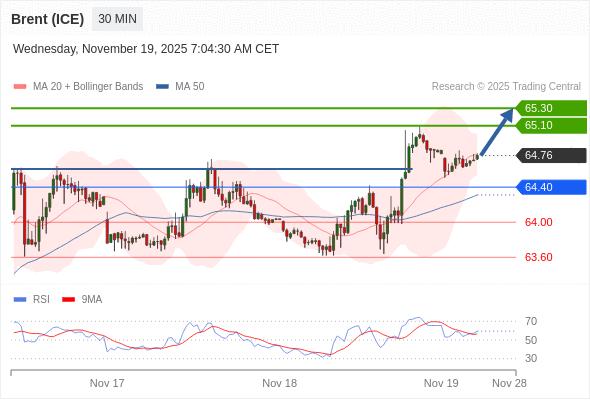 在 64.40 之上,看涨,目标价位为 65.10 ,然后为 65.30 。
